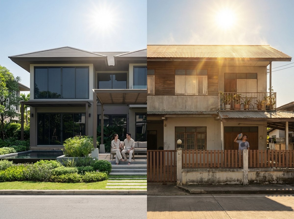 ในทางฟิสิกส์ วัสดุก่อสร้างทั่วไป เช่น ปูน, กระเบื้องเซรามิก, หรือแม้แต่ฟิล์มสีมาตรฐาน เปรียบเสมือน "กระทะเหล็ก" ที่มีคุณสมบัติในการดูดซับและนำความร้อน (Conduction) ได้ดีเยี่ยม เมื่อพื้นผิวภายนอกอาคารรับรังสีความร้อนจากดวงอาทิตย์จนมีอุณหภูมิสูงถึง 65-75°C พลังงานความร้อนมหาศาลนั้นจะถูกส่งผ่านโครงสร้างโมเลกุลที่หนาแน่นของวัสดุเข้ามาสะสมภายใน ผลลัพธ์คือผนังและเพดานที่ร้อนระอุ กลายเป็น "แผ่นประคบร้อน" ขนาดใหญ่ที่แผ่รังสีความร้อนออกมาตลอดเวลา ทำให้เครื่องปรับอากาศต้องทำงานหนักเพื่อต่อสู้กับความร้อนที่เข้ามาไม่หยุดหย่อน